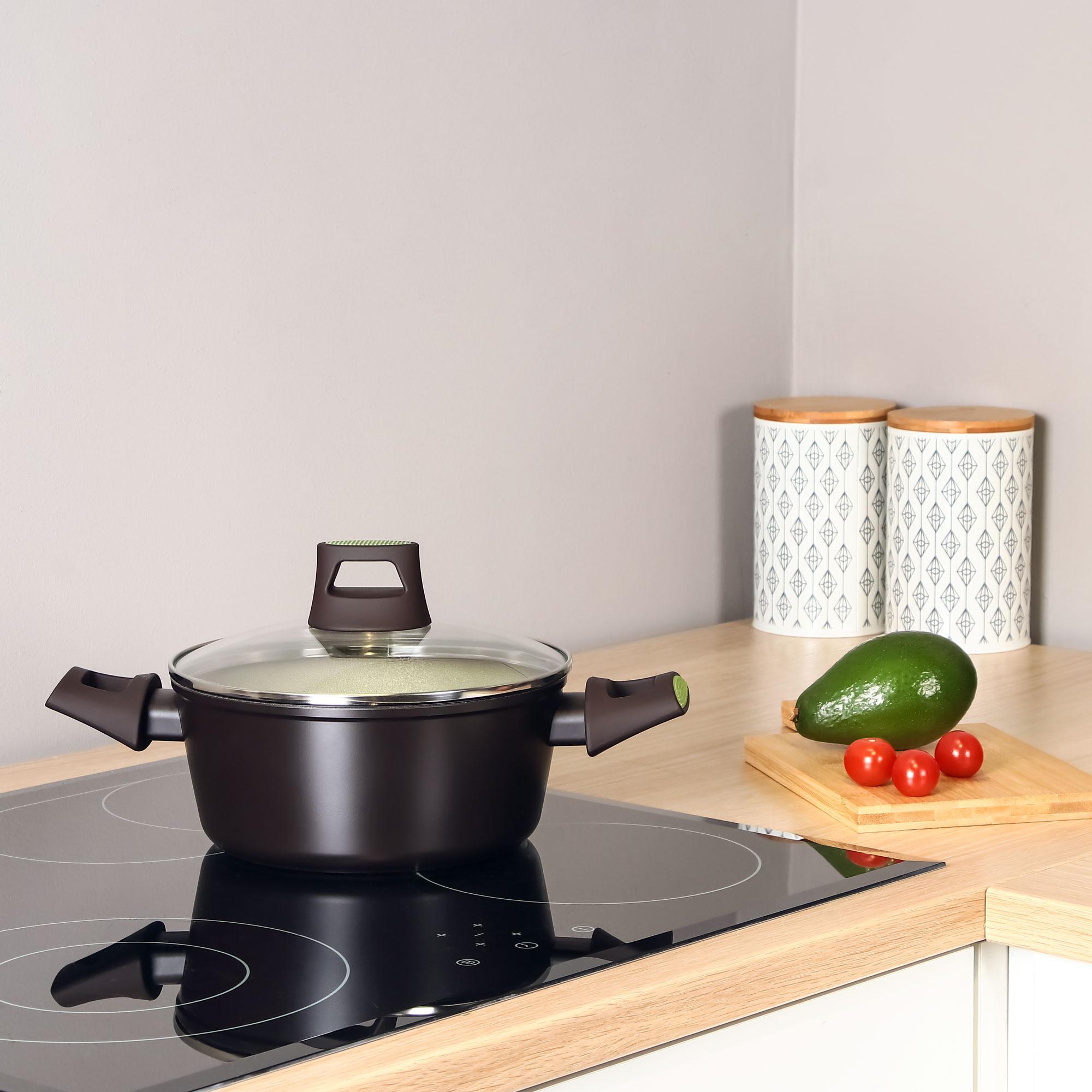 Кастрюля изготовлена из литого алюминия с антипригарным алмазным покрытием высочайшего качества. Устройте на кухне настоящую феерию вкуса с посудой высшего качества! Высокие стенки, эргономичная форма и утолщенное индукционное дно - кастрюля равномерно разогревается и позволяет легко контролировать процесс приготовления. Бакелитовые ручки не нагреваются, не плавятся и обеспечивают безопасное использование в процессе приготовления пищи. Внешнее жаропрочное покрытие защищает кастрюлю с толстым дном от нагара, надолго сохраняя её внешний вид. Кастрюлю можно использовать как на традиционных плитах, так и на индукционных.