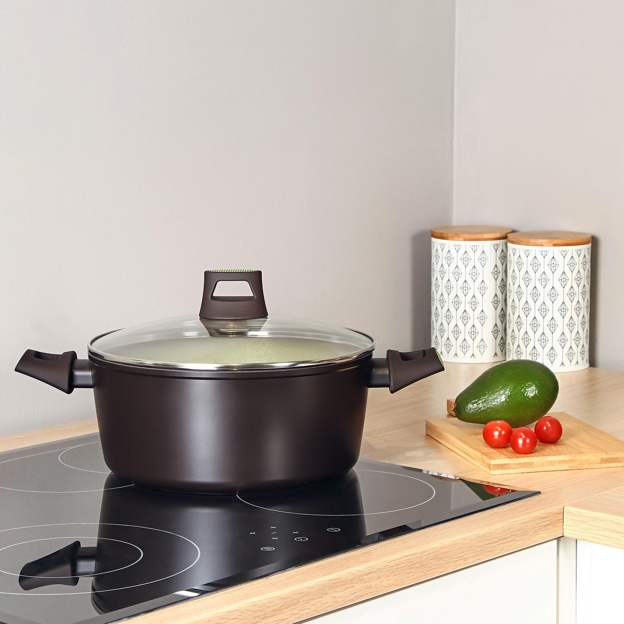 Кастрюля изготовлена из литого алюминия с антипригарным алмазным покрытием высочайшего качества. Устройте на кухне настоящую феерию вкуса с посудой высшего качества! Высокие стенки, эргономичная форма и утолщенное индукционное дно - кастрюля равномерно разогревается и позволяет легко контролировать процесс приготовления. Бакелитовые ручки не нагреваются, не плавятся и обеспечивают безопасное использование в процессе приготовления пищи. Внешнее жаропрочное покрытие защищает кастрюлю с толстым дном от нагара, надолго сохраняя её внешний вид. Кастрюлю можно использовать как на традиционных плитах, так и на индукционных.