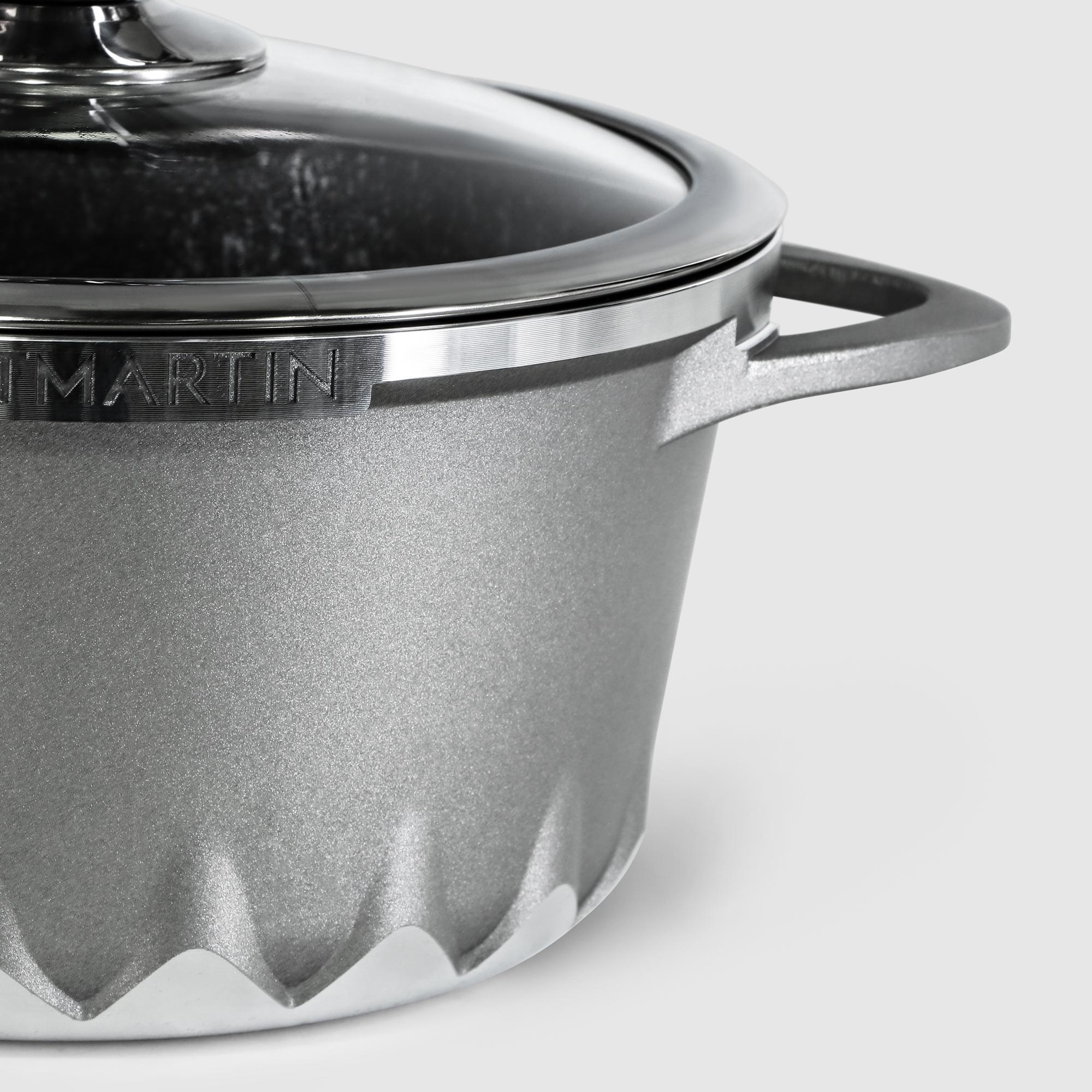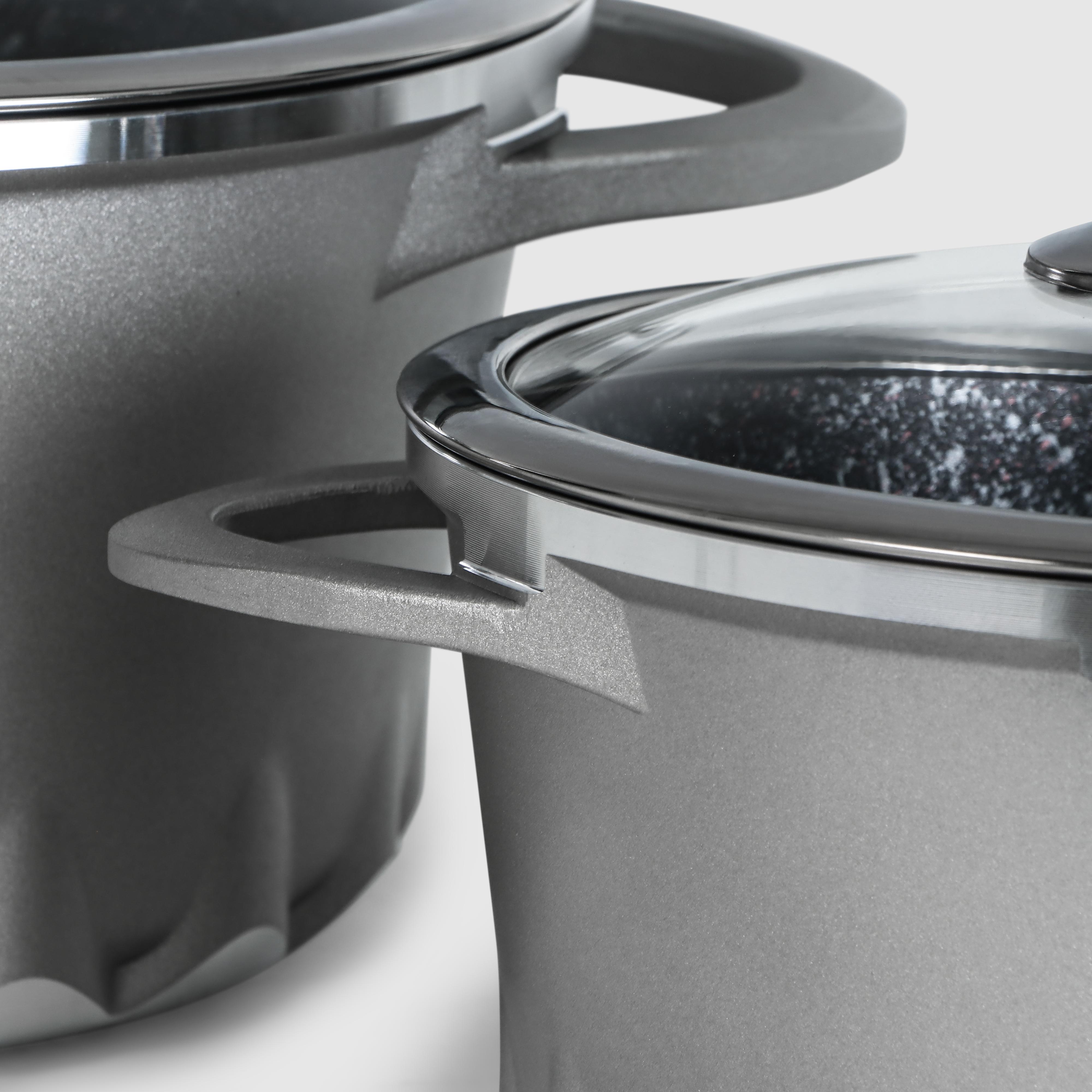 Кастрюля с крышкой 26 см обьемом 5,7 литра изготовлена из литого алюминия, устойчива к царапинам и износу. У кухонной посуды имеет ферромагнитную пластину, благодаря чему возможно использование на индукционных плитах. Толщина дна в 5 мм не позволит вашему блюду пригореть и сохранит первоначальный внешний вид посуды без деформации. Антипригарное покрытие полностью безопасно, так как не содержит опасных примесей. Крышка кастрюли с нержавеющим ободком и пароотводом. Кастрюля с крышкой подойдет для всех типов плит.