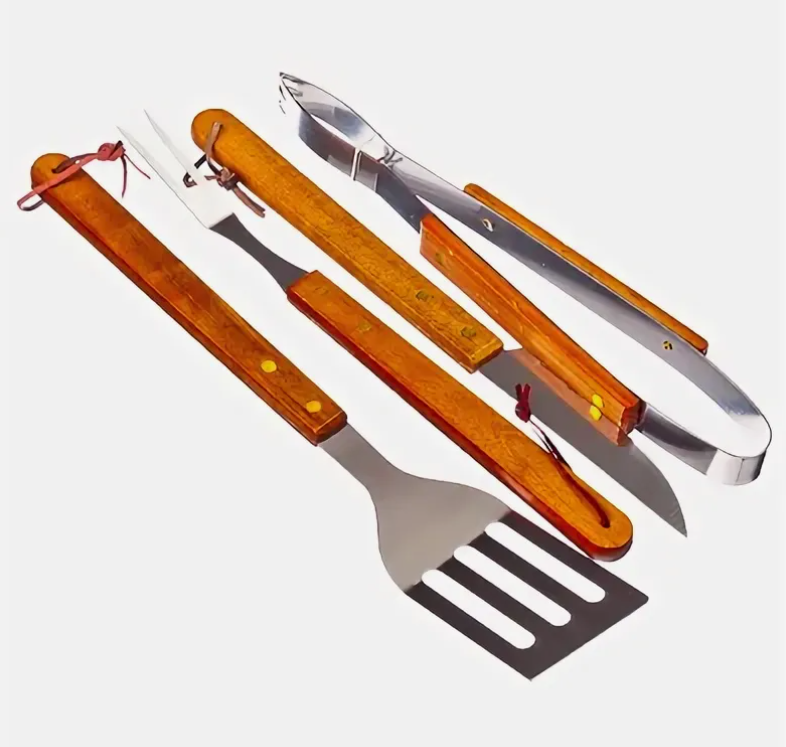 Всем любителям готовить на природе необходимо иметь под рукой набор инструментов для гриля и барбекю. Такой комплект обеспечит: безопасное приготовление, высокую скорость работы, удобный процесс жарки блюд на открытом огне. Все аксессуары изготовлены из прочной стали, имеют красивое оформление и оптимальные в использовании размеры. Лопатка 33x7,4см, 110г Вилка 32,5x3 см, 63г Нож 33x3,5см, 108г Щипцы 34x6,5см, 181г.