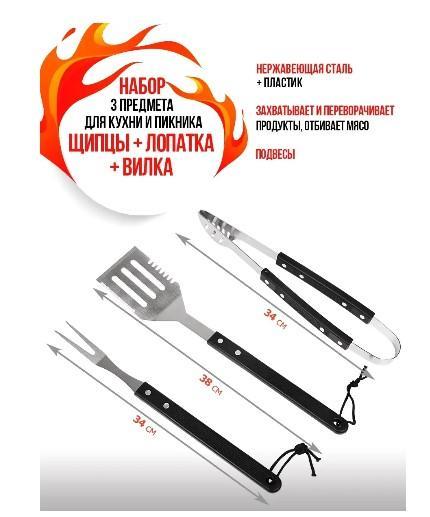 Набор для гриля СОКОЛ состоит из 3 предметов: щипцов 34 см, вилки 34 см и лопатки 38 см. Оптимальная длина изделий предохраняет руки от случайных ожогов. Лопатка позволяет переворачивать на решетке любые продукты: стейки, бургеры, овощи. Вилкой удобно снимать мясо, птицу, рыбу с решетки "гриль". Благодаря специальной конструкции, щипцы помогают переместить еду, не нарушив ее форму, тем самым сохраняют эстетичный вид для подачи блюда. Аксессуары выполнены из прочной и экологичной нержавеющей стали: выдерживают большие перепады температур, и устойчивы к коррозии. Эргономичные рукоятки из специализированной пластмассы не позволяют изделиям скользить в руке в процессе готовки. Набор для барбекю пригодится каждой хозяйке на кухне, часто используется для приготовления блюд на древесном угле в походных условиях совместно с мангалом или барбекю.
