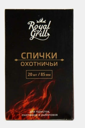 Охотничьи спички ROYALGRILL, 85 мм, 20 шт., предназначены для розжига огня, костра, отлично подойдут для туристов, охотников и рыболовов. Изделие выполнено из древесины, на один конец которой нанесен зажигательный состав. В коробке предусмотрено 20 спичек. Упаковка удобна в использовании, надежно защищает спички от влаги и от их потери. Спички прекрасно горят в нестандартных погодных условиях , они не гаснут даже в ветреный день и под дождем. Поэтому, каминные спички полезны не только тем, кто использует бытовые отопительные печи в качестве основного источника тепла, но и любителям барбекю.