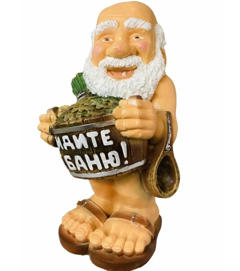 Садовая фигурка Банщик Иди в баню Н-61см. Размер фигурки: высота 61 см, длина 32 см, ширина 33см. Вес фигурки 5.2 кг. Фигурка изготовлена из искусственного камня полистоуна, который сочетает в себе все качества природного материала. Изделия из полистоуна отличаются повышенной прочностью и износостойкостью, они устойчивы к воздействию влаги, ультрафиолетовых лучей и других разрушающих факторов внешней среды, а используемые при создании фигурок лакокрасочные материалы устойчивы к перепаду температур и погодным осадкам. Садовые фигурки из полистоуна станут украшением Вашего садового участка и придадут ему неповторимый вид.