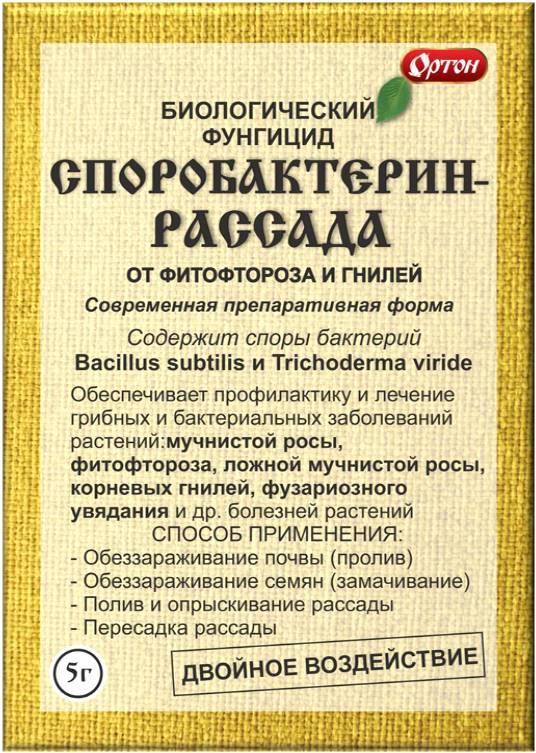 Биологический фунгицид ОРТОН СПОРОБАКТЕРИН-РАССАДА 5 г 04-006 используется для защиты овощных, плодовых, цветочных культур и газонных трав от грибных и бактериальных болезней в период выращивания рассады. Действующим веществом препарата являются живые споры гриба Trichoderma viride (триходерма) и бактерия Bacillus subtilis (сенная палочка). Препарат обеспечивает высокую эффективность при защите растений от мучнистой росы, фитофтороза, ложной мучнистой росы, корневых гнилей, фузариозного увядания, бактериальных пятнистостей, черной ножки, сосудистого и слизистого бактериоза, ризоктониоза, монилиоза, макроспориза, серой гнили, парши и других болезней.