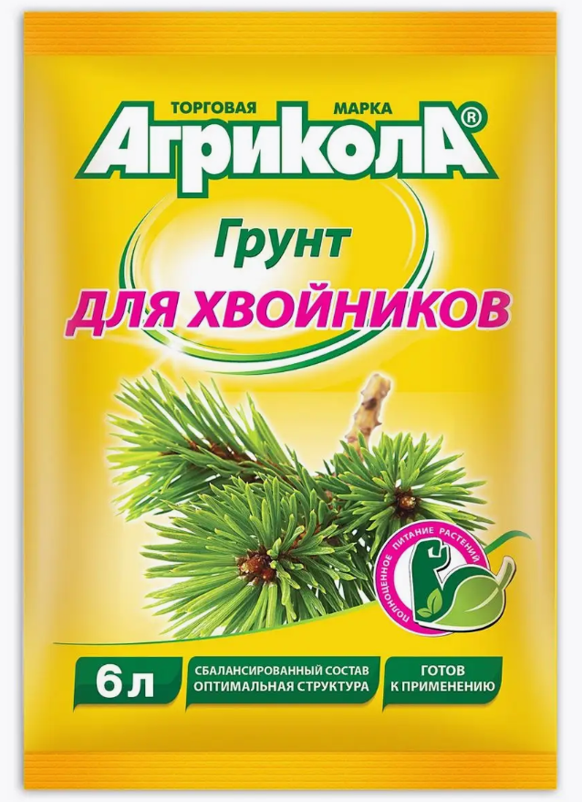 Грунт АГРИКОЛА для хвойных, 6 л. Готовый к применению питательный грунт для выращивания декоративных хвойных растений (туя, тсуга, кипарисовик и др.). Универсален в применении для комнатных и садовых растений. Обладает хорошей способностью накапливать и равномерно отдавать питание. Сохраняет постоянную рыхлость и активность почвы благодаря наличию верхового торфа, который обеспечивает поступление воздуха к корням и одновременно сохраняет влагу. Содержит стандартный стартовый минеральный комплекс, подходящий для широкого ассортимента декоративных хвойных растений. При мульчировании приствольных кругов 3 л на 1 кв.м. При подкормках: 1-2 л на 1 кв.м. При высадке в грунт: необходимое количество грунта для заполнения посадочной емкости (ямы, грядки и т.д.) Допускается смешивание грунта с минеральной почвой в соотношении 1:1-1:3. Состав: Азот (NH4+NO3) – не менее 150 мг/л, Фосфор (P2O2) – не менее 200 мг/л, Калий (K2O) – не менее 250 мг/л, Ph солевой суспензии 5,5-6,5. Срок годности 5 лет.