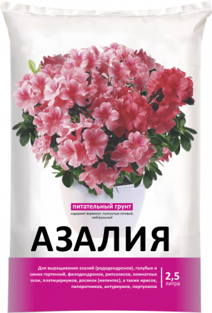 «Азалия» — среднекислый питательный грунт, полностью готовый к применению для азалий (рододендронов), голубых и синих гортензий, филодендронов, рипсалисов, комнатных осок, платицериумов, росянок (непентес), неперстянок, а также вереска, голубики, черники, клюквы, брусники, ирисы, папоротников, антуриумов, портулаков. Почвогрунт можно использовать для высева бромелиевых или как составляющую субстрата для орхидей. Для улучшения воздухо- и влагообмена в грунт добавлен вермикулит (экологически чистый слоистый минерал), что значительно увеличивает всхожесть семян и приживаемость растений.