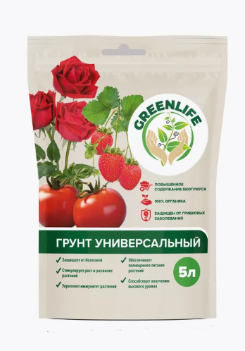 Грунт универсальный Green Life • Обеспечивает полноценное питание растений • Защищает от болезней • Стимулирует рост и развитие растений • Укрепляет иммунитет растений • Способствует получению высокого урожая Грунт универсальный GREEN LIFE полностью готов к применению. Применяется для выращивания рассады овощных и цветочных культур, комнатных растений; для заполнения посадочных лунок для рассады овощных и цветочных культур и посадочных ям для плодово-ягодных и декоративных деревьев и кустарников; для формирования плодородного слоя при закладке садов, овощных грядок, разбивке цветников; для подсыпки к растениям вместо окучивания и мульчирования почвы.