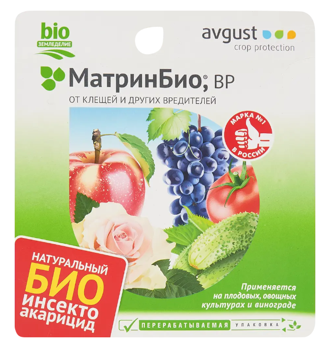 МатринБио - уникальный на российском рынке биопрепарат для защиты овощных, плодовых культур и винограда от широкого спектра вредителей. Высокоэффективен против клещей (войлочный клещ (зудень), паутинный клещ и другие), тепличной белокрылки, тли, трипсов, цикадок, совок, гроздевой листовёртки и прочих. Состав препарата имеет растительное происхождение, благодаря чему безопасен для растений, человека и окружающей среды. Не вредит хищным клещам - энтомофагам, которые избавляют растения от вредителей. Насекомые и клещи, после контакта с препаратом, снижают двигательную активность, перестают питаться и погибают за 3-5 дней.