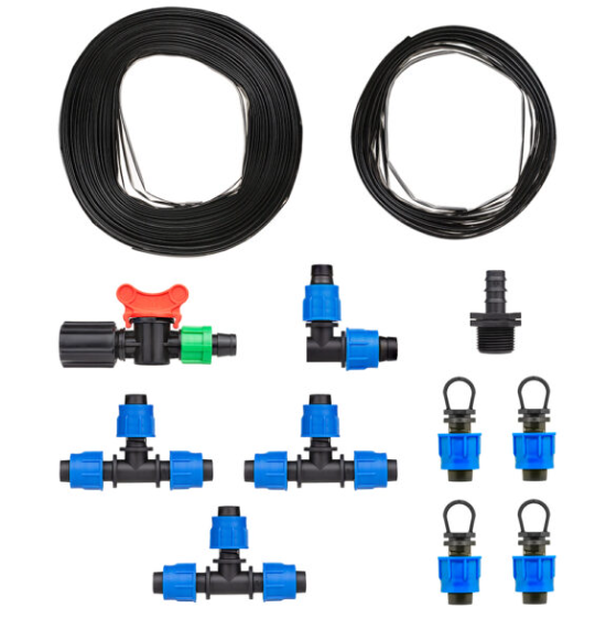 – Капельная лента: 40 м.¶¶– Лента, слепая: 10 м.¶¶– Кран переходной для ленты 16мм на резьбу 1/2": 1 шт.¶¶– Тройник для ленты, зажимной: 3 шт.¶¶– Заглушки для ленты: 4 шт.¶¶– Уголок для ленты, зажимной: 1 шт.¶¶– Адаптер для трубки с внешней резьбой 1/2": 1 шт.¶¶