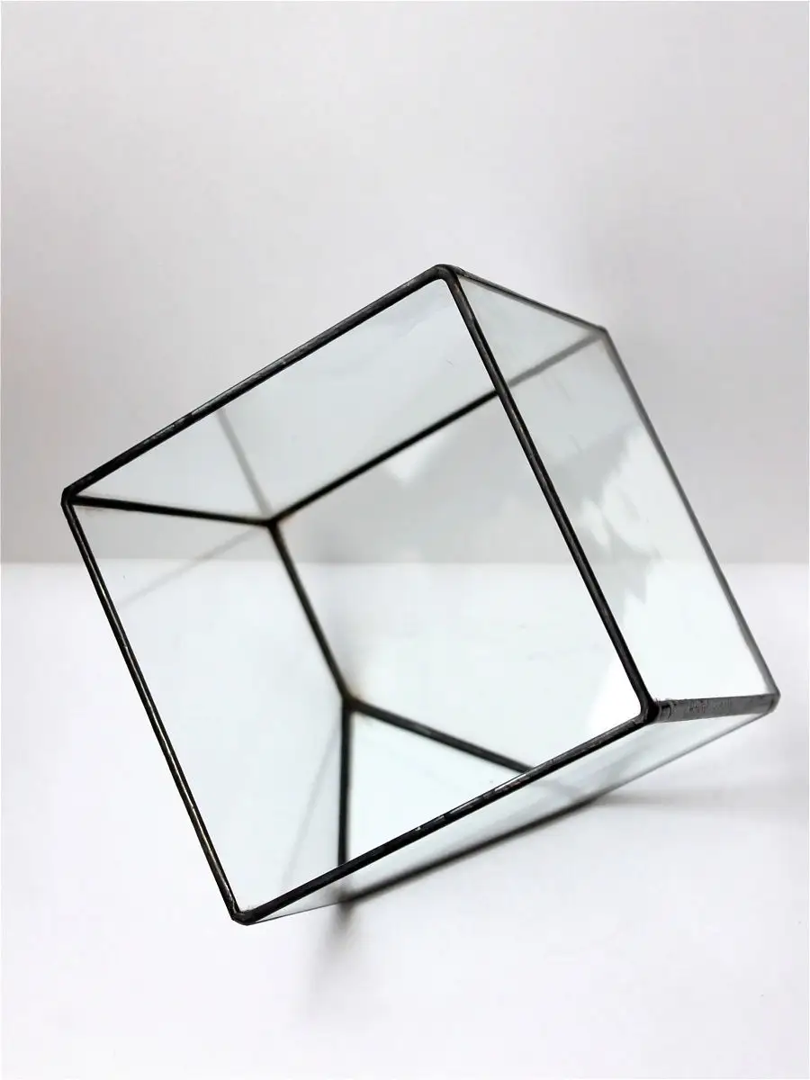 Геометрическая стеклянная ваза для флорариума в форме Куба со скошенным углом. Флорариум изготовлен из стекла и металла вручную в витражной технике "Тиффани". В нем отсутствует одна из граней для удобного ухода за растениями. Флорариумы используются для выращивания мини садов с сукулентами и кактусами, орхидеями, фикусами или другими лиственными растениями. Вы можете высадить в эту форму одно растение среднего размера или сделать композицию микс из нескольких небольших. Можно использовать различный декор: мох, песок, фигурки и многое другое. Растения можно поливать, форма хорошо держит влагу.Швы черные, покрыты антиоксидантным составом, что позволит флорариуму оставаться в идеальном виде максимально долго.Так же эту форму можно использовать в качестве подсвечника, вазы для хранения или для различного декора дома.Размер граней 15 см.