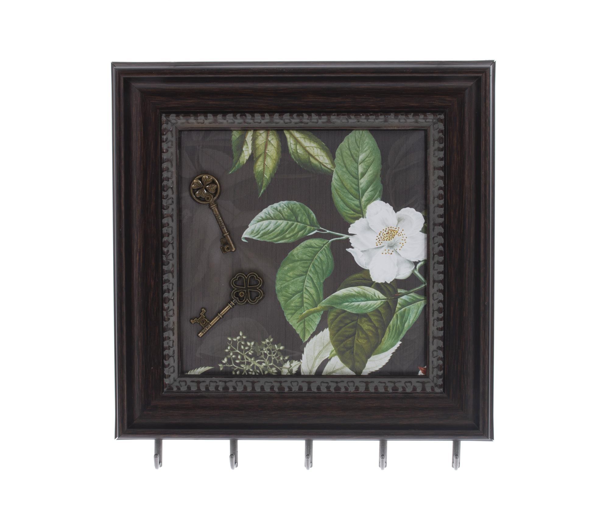 Ключница открытого типа с пятью крючками, изготовлена из пластика. Цвет рамки - коричневый с металлическим декором в виде двух ключей. Крепится на стену с помощью двух металлических петелек.