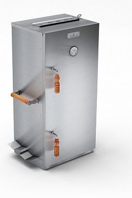 Тщательно продуманная конструкция выполнена из нержавеющей стали толщиной 1-2 мм. Дверь с двойным запором оснащена термометром для контроля температуры внутри бокса. Материал не окисляется, легко очищается от загрязнений и не влияет на вкусовые качества блюд. Внутри коптильня холодного копчения оснащена решетчатыми полками, жиростоками, крюками для подвешивания мяса или колбас. На боковых стенках короба есть ручки с деревянными вставками для комфортной транспортировки устройства.