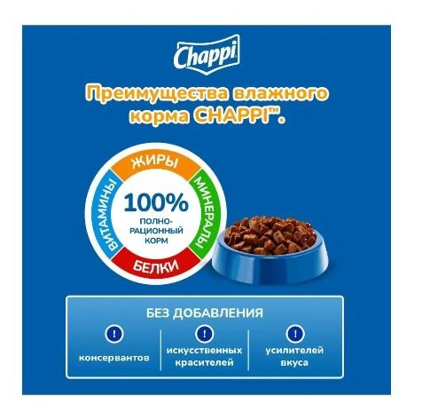 Корм для собак CHAPPI - это вкусный мясной обед, который обязательно понравится Вашей собаке. Он оптимально сбалансирован и содержит все необходимое для того, чтобы поддерживать здоровье и хорошее самочувствие Вашего любимца. Рекомендуемое количество корма CHAPPI вес животного, кг - упаковок корма в сутки, шт: 3 кг - 4; 5 кг - 6; 7 кг - 7-8; 10 кг - 9-10. Вашего питомца следует кормить кормом комнатной температуры.