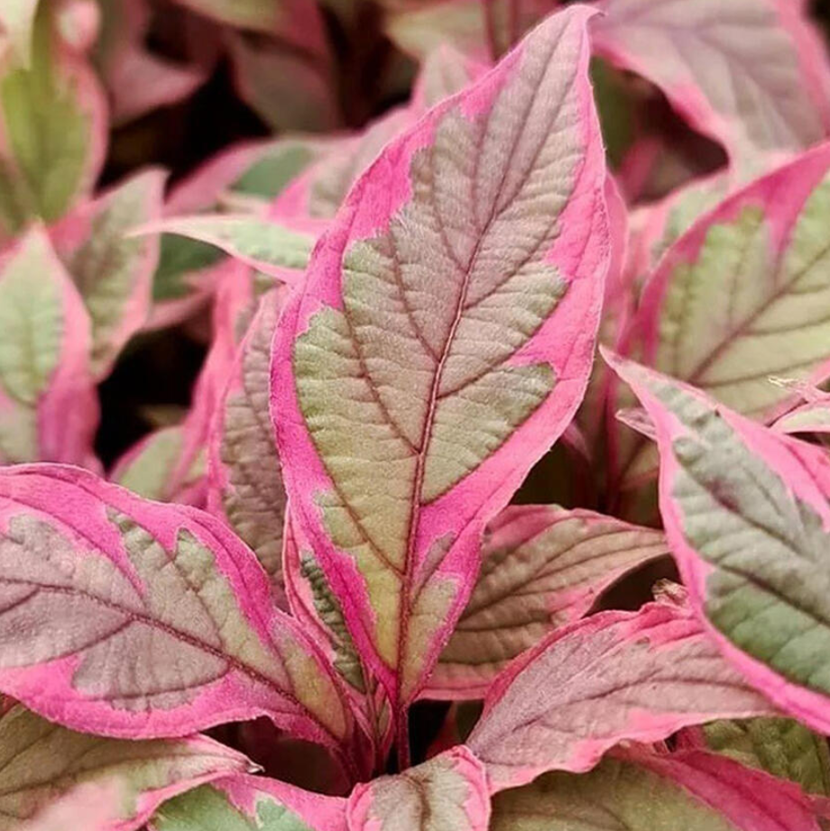 Красноватые побеги обильно покрыты небольшими пестрыми листочками. Пластинки большую часть сезона обладают зеленым окрасом с розово-белым окаймлением. К осени их оттенок трансформируется в интенсивный ярко-розовый. Формой скрученные листочки напоминают лодочки. К концу осени или началу зимы они опадают, обнажая эффектно выглядящие ветви.