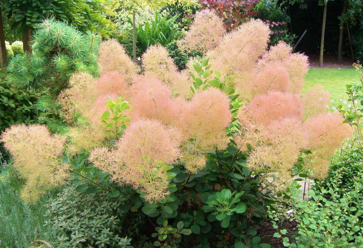 Скумпия кожевенная Янг Леди - декоративный листопадный кустарник с широкоовальной сильноветвистой кроной 1,5 м. Листовые пластины крупные, овальной формы, зеленые с желтым оттенком. Цветет маленькими розовыми цветками, собранными в ажурные соцветия. Плоды декоративные, черные. Цветение красивое и обильное.