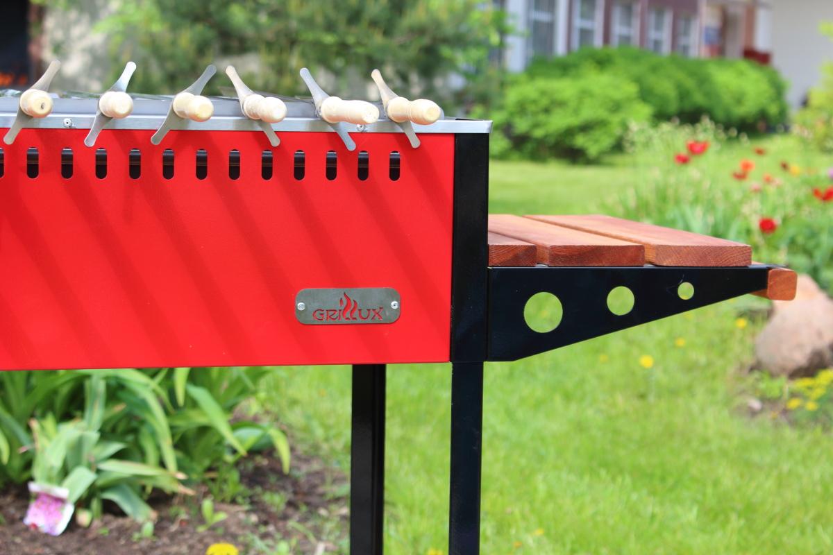 Мангал «Master» — это достаточно большое и удобное устройство для приготовления вкуснейших блюд из любимых продуктов на открытом воздухе. Предусмотренные колеса позволяют быстро и легко перемещать устройство на оптимально подходящее место для полноценного отдыха с кампанией друзей или родственников. Мангал изготавливается из качественной стали, покрашенной для более привлекательного вида. В конструкции имеются удобные и функциональные столики, отделанные прочной древесиной, способные выдержать вес приготовленных продуктов, кухонной утвари и других необходимых вещей. Благодаря продуманной конструкции, к мангалу можно прикасаться, не боясь обжечься — двойные стенки практически не нагреваются снаружи, сохраняя тепло внутри устройства.