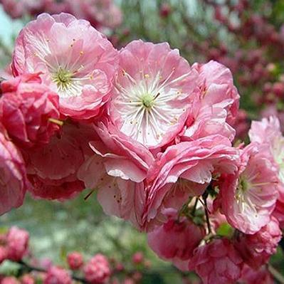 Кустарник среднего размера или деревце. Очень эффектно цветет до распускания листьев. Крупные, розовые и махровые цветки не дают плодов. Цветение очень обильное и пышное. Название сорта переводится как "Розовая пена". Осенью листья становятся желтыми.