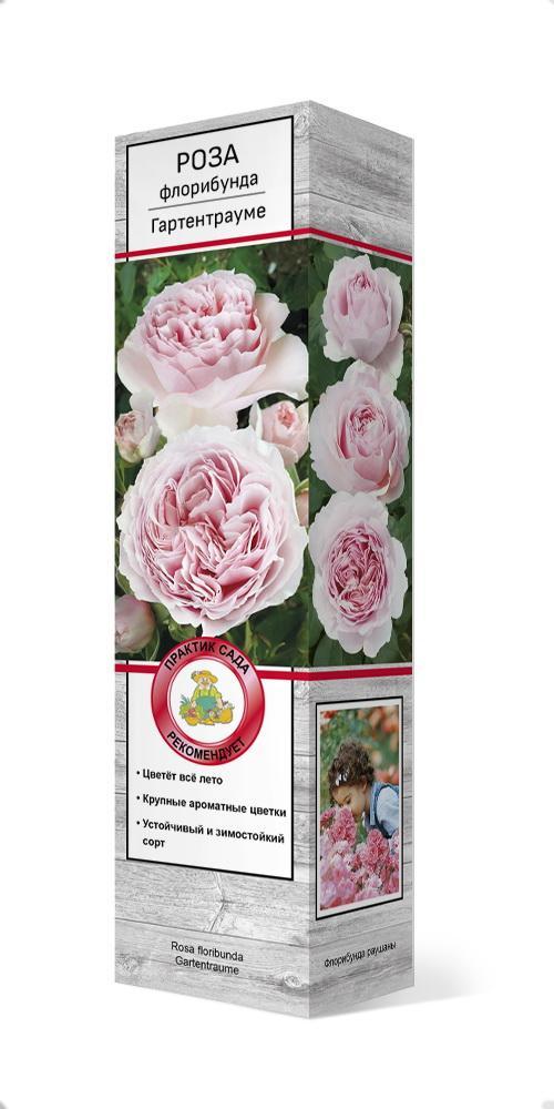 Роза Гартентрауме – сорт розы шраб, выведенный в Германии в 2005 году. Кусты среднего размера, высотой от 80 до 140 см. Листья темно-зеленые, блестящие. Бутоны распускаются на концах побегов по 3-5 штук. Цветки светло-розовые, густомахровые, диаметром 10-12 см, обладают сильным и очень приятным ароматом. Куст растет медленно и основательно, поэтому очень хорошо смотрится при посадке отдельной группой по 3 или 5 кустов. Цветет обильно в течение всего лета.