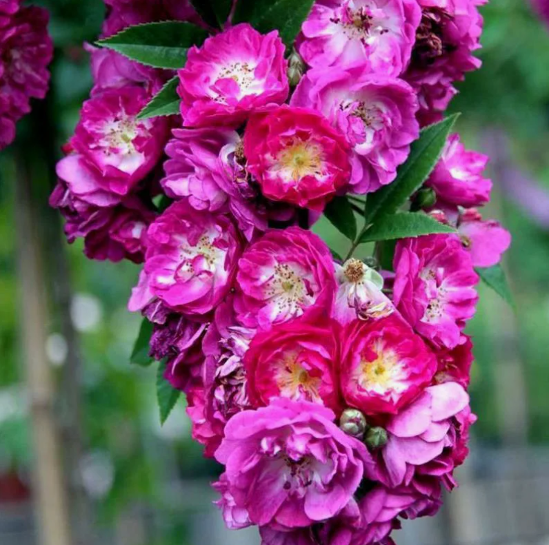Эта плетистая роза-рамблер цветет кистями некрупных цветков, вначале лиловых, а позднее бледно-фиолетовых. Сорт достигает 2,5-3 м в высоту. Цветение ремонтантное, до первых морозов, чтобы стимулировать повторное зацветание, следует удалять отцветающие цветки. Сорт получил в 2006 г серебряную медаль в Баден-Бадене. Насыщенный сладкий аромат. Очень устойчив к заболеваниям. (TAN) Роза выведена в Великобритании, Бернардом Мерингом (Bernhard F. Mehring) из компании Eurosa в 2003 г. Родителями сорта были Veilchenblau и Super Excelsa. Цветки полумахровые, около 3 см в диаметре, красивого пурпурно-мажентового цвета. Аромат сладкий, средней интенсивности. Листва очень устойчива к болезням, красивой фактуры. Шипы мелкие, редкие. Зацветает рано, одной из первых. Цветение обильное, почти непрерывное – в то время, когда отцветают кисти первой волны цветения, роза уже выпускает молодые побеги с новыми бутонами.