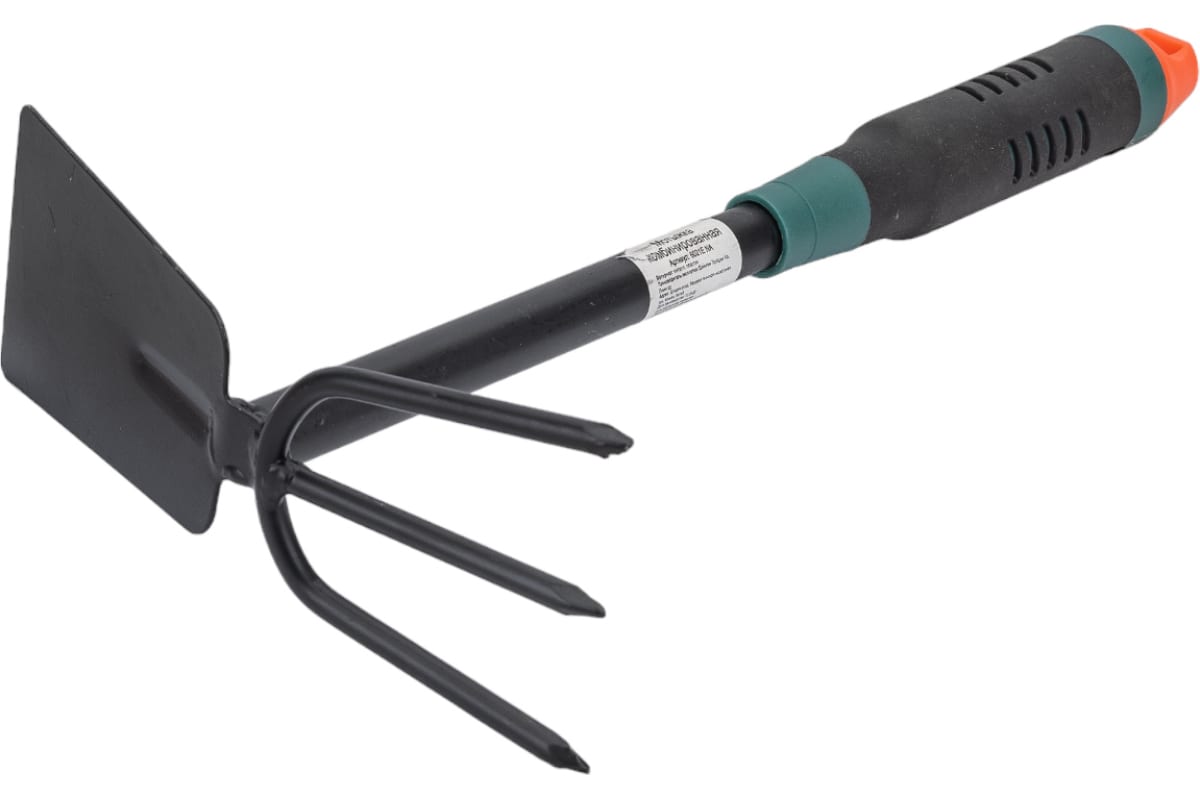 Пластиковая рукоятка со специальной накладкой не скользит в руках, обеспечивая комфортное использование огородного инструмента.
