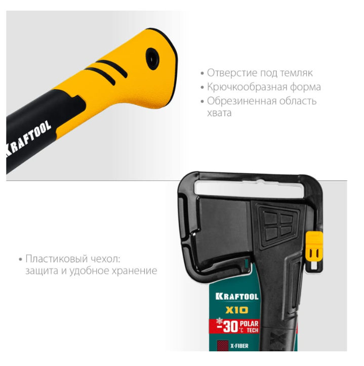Топорище выполнено из армированного нейлона X-Fiber - инновационный материал, прочный как металл, но при этом имеет малый вес. Кованая голова из углеродистой стали и рукоятка надежно соединены в одно целое, что исключает выпадение лезвия.