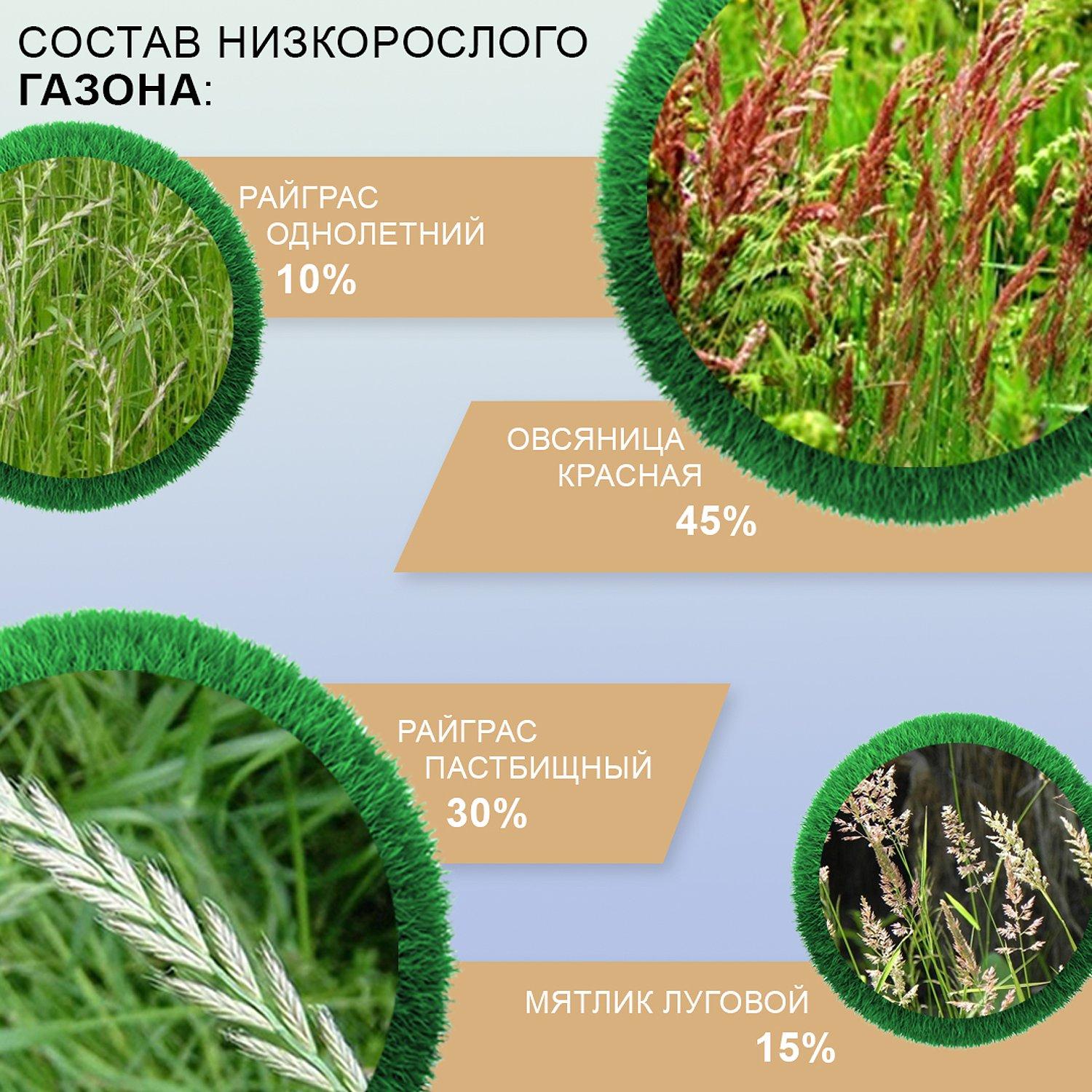 Аккуратный и красивый газон, не требующий стрижки, — это мечта многих дачников. Такие растения отлично подойдут тем, кто не может уделять им много времени. Для составления низкорослых покрытий площадок используют определённые виды и сорта трав. Они не вырастают высокими и отлично подходят для «ленивого газона». При этом растения хорошо разрастаются, являются многолетниками и беспроблемно размножаются вегетативно. Их можно использовать для различных видов травяного покрытия.Наиболее предпочтительными периодами для посева считается весна и осень. Они характеризуются обильными осадками, что хорошо влияет на появление всходов и рост газонной травы. Состав: Овсяница красная - 45% Мятлик луговой - 15% Райграс однолетний - 10% Райграс пастбищный - 30%