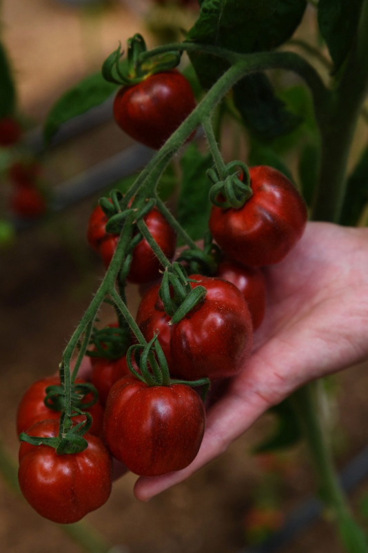 Плоды кубовидные, слаборебристые, плотные, в технической спелости зеленовато-фиолетовые, в биологической красно-бордовые с фиолетовыми разводами, массой 40-50 г, собраны в правильные, ровные кисти, не растрескиваются и не осыпаются.