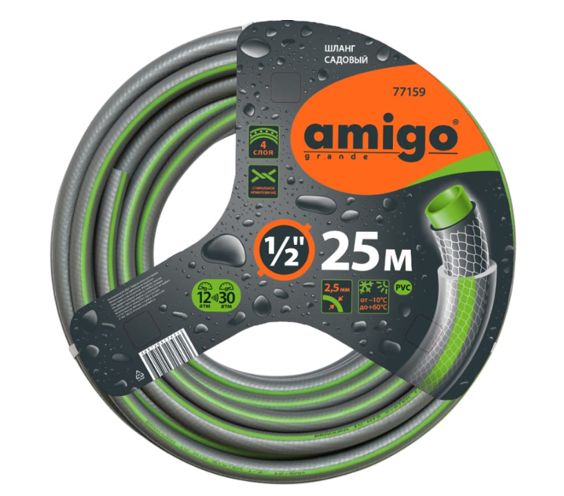 Садовый четырехслойный шланг AMIGO 1/2", 25 м 77159 предназначен для полива, а так же для перекачки и прочих работ с жидкостями, в том числе с пищевыми.