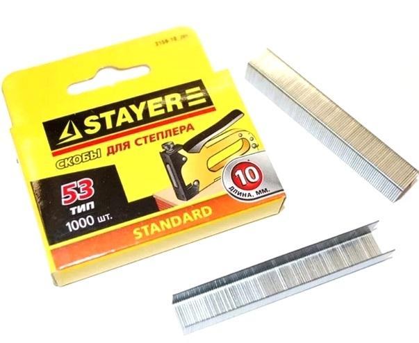Скобы STAYER 3159-10_z02, предназначены для крепления тканых материалов: ткани, обивки, холста и прочего к поверхности из дерева, ДСП и т.п. с помощью скобозабивного пистолета.
