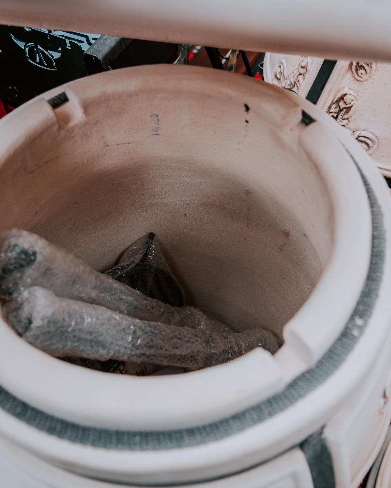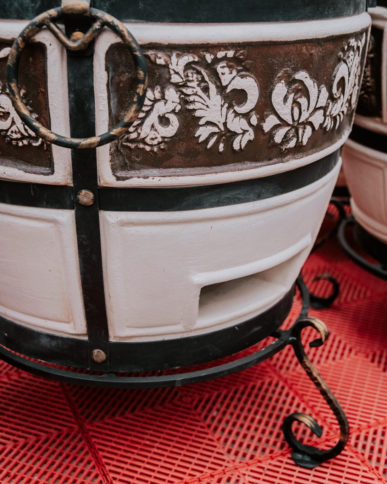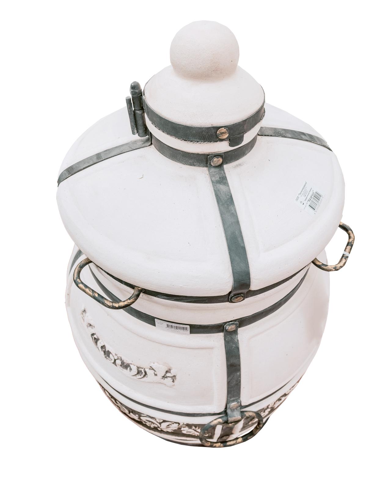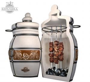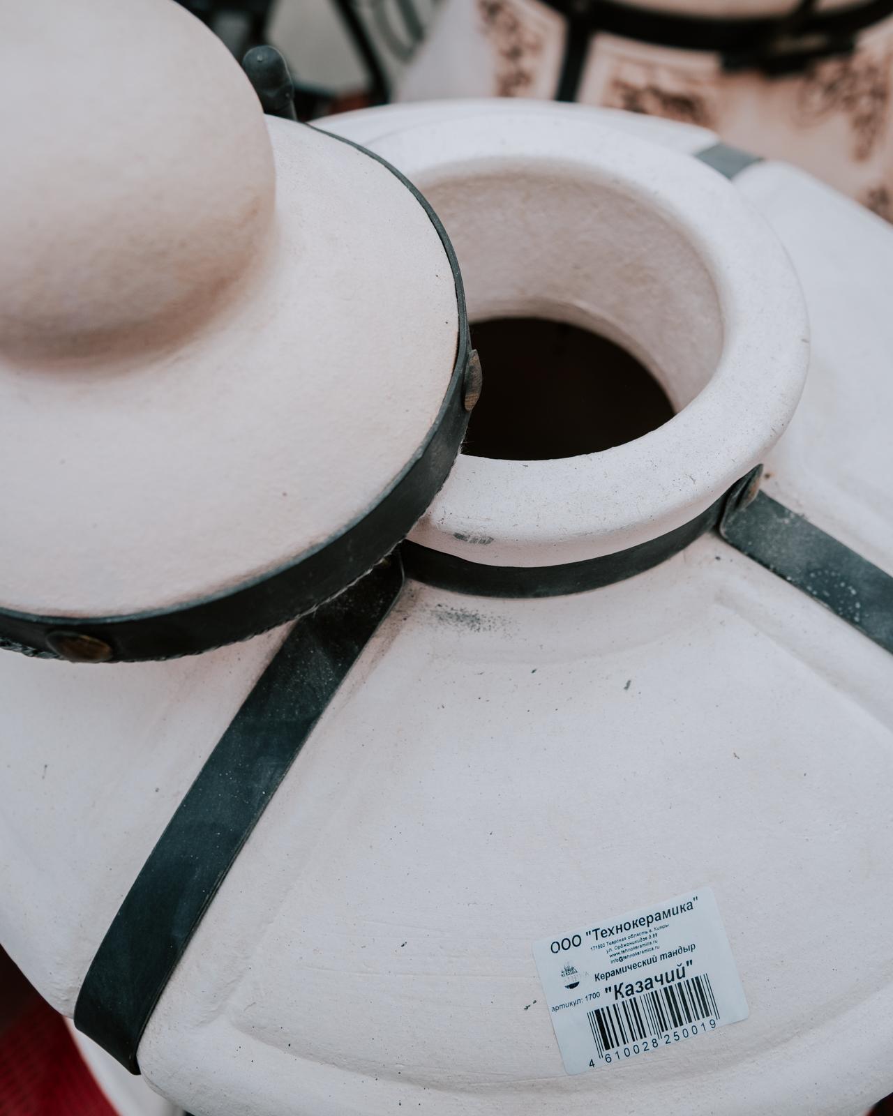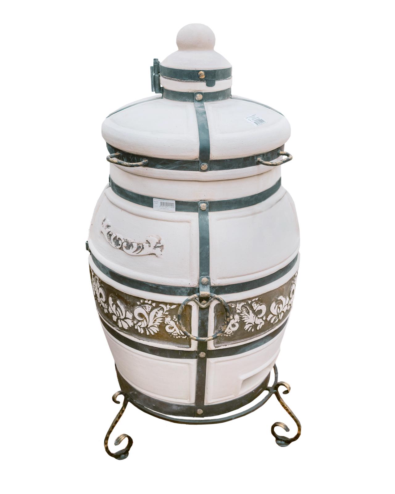 Керамическая печь тандыр «Казачий» выполнен в виде округлого бочонка большого объёма. Тандыр имеет крышки двух уровней (колпачок и крышку). Удобно выполненный колпачок, позволяет не терять тепло при открытии тандыра. А крышка с удобными ручками позволяет легко открывать тандыр и закладывать в него продукты для приготовления. Красоту тандыру придаёт интересный узор, расположенный в центральной части. В разогретом состоянии тандыр керамический держит тепло в течение 2-4 часов. Большой объём тандыра и его толстые стенки дают возможность приготовить за один розжиг до 5 кг мяса и других блюд. Обладает отличными характеристиками: высокой теплопроводностью, экологичностью, прочность.