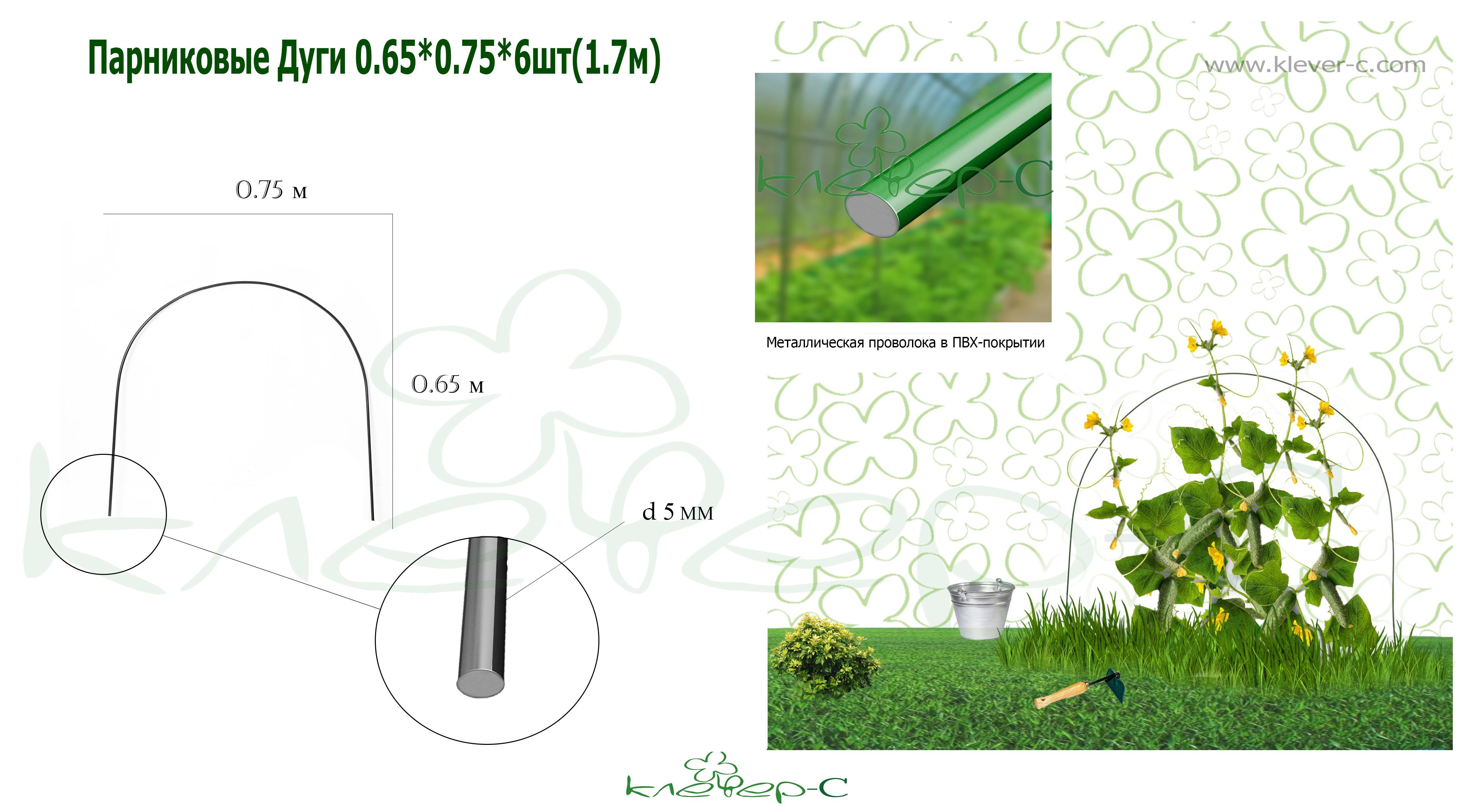 Дуга для парника размером 650 × 750 × 5 мм применяется на загородных участках для поддержания укрывного материала (пленки), создавая минипарник. Ее высоты достаточно для выращивания рассады, ранней зелени, невысоких растений. Изготовлена из металлической трубы и обладает высокой прочностью. За счет ПВХ покрытия изделие не подвержено коррозии. В комплекте 6 штук.
