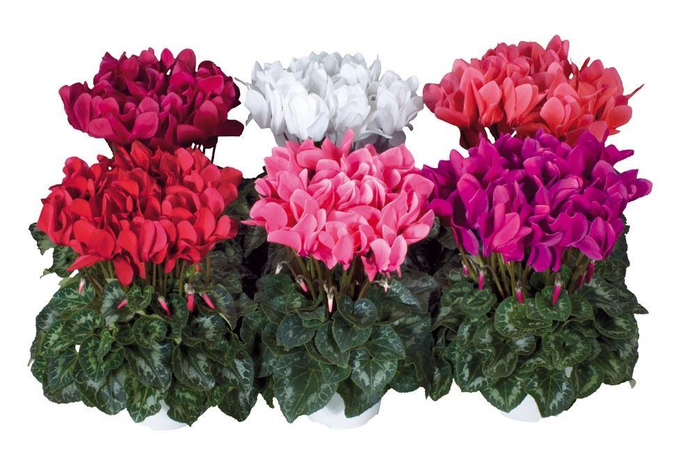 Цикламен (Cyclamen) — это невысокий (до 30 см) травянистый многолетник с яркими длинночерешковыми прикорневыми листьями и одиночными цветками на длинных цветоносах. Подходит для выращивания в помещении, а также в саду и на балконе. Цветение приходится на конец лета — начало осени.