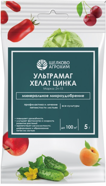 Октябрина Апрелевна Ультрамаг Хелат цинка – концентрированное жидкое бесхлорное удобрение с высоким содержанием цинка в легкоусваиваемой растений форме. Применяется для профилактики и лечения пятнистости (хлороза) листьев всех культур. Препарат положительно влияет на процессы цветения, плодоношения, роста и развития, формирование плодов, исключает появление хлороза, повышает устойчивость к неблагоприятным факторам (смена температур, засуха), препятствует мелколистности, а также деформации и образованию пятен на листьях.