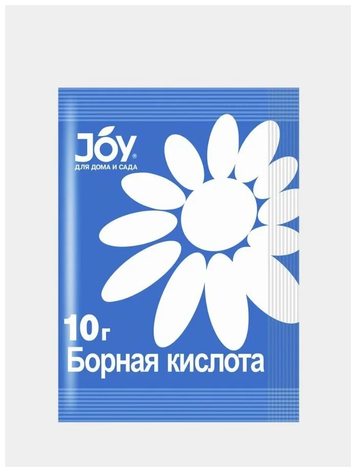 Борная кислота JOY 10 г Joy Борная кислота - неорганическое порошковое микроудобрение, содержащее важный для растений микроэлемент бор. Применяется в качестве внекорневой подкормки для всех овощных, плодово-ягодных и цветочно-декоративных культур. При недостатке бора нарушается рост растений и плодоношение. Препарат увеличивает количество завязей, стимулирует образование новых точек роста стеблей и корней, повышает содержание сахара и вкусовые качества плодов, предотвращает развитие сухих и корневых гнилей, бактериоза, ведет активную борьбу с муравьями и тараканами. Удобрение содержит полный комплекс веществ, необходимых для полноценного и сбалансированного питания растений.